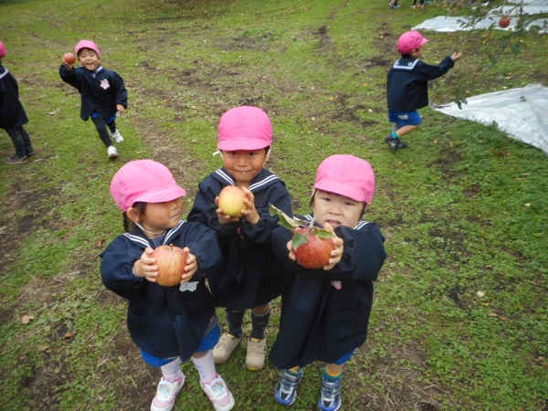おみやげのリンゴももらえて。おなかに抱えて慎重に。